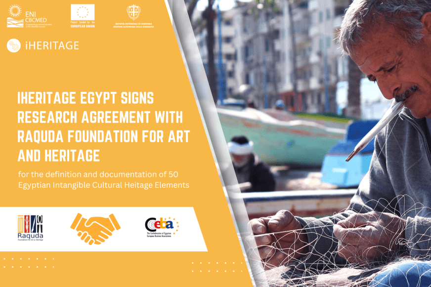 وقّع اتحاد منظمات الأعمال المصرية – الأوروبية، الشريك المصري لمشروع iHERITAGE في مصر على اتّفاقيّة بحث مع مؤسّسة راقودة للفنّ والتّراث تهدف إلى صون وتوثيق التراث الثقافي اللامادي لمدينة الاسكندريّة. تتضمّن الاتّفاقيّة التعريف والتوثيق والبحث العلمي اللازم لتحديد 50 عنصرًا من عناصر التراث الثقافي اللامادي بما في ذلك الأمثال الشعبية والحرف اليدوية والأطعمة والملابس والمناسبات والاحتفالات. تشمل منهجية المشروع استخدام التكنولوجيا للتوثيق وتحديد المخاطر وتقييمها ورسم الخرائط والتصوير وإعادة ربط اكتشافات التراث اللامادي بقصصها الأصلية. يسعى المشروع أيضا إلى دراسة التخطيط الحضري لهذه العناصر في حاضنات التراث الخاصة بها وتصميم نظام لتقييم مراقبة الجودة لعملية التوثيق والنتائج.