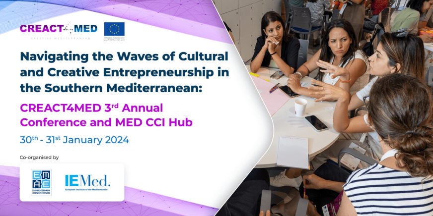 يلتئم المؤتمر السّنوي الثالث لمشروع CREACT4MED والمركز المتوسّطي للصّناعات الثقافيّة والابداعيّة: الإبحار في عالم ريادة الأعمال الثقافية والإبداعية في جنوب المتوسط يومي 30 و31 جانفي/يناير 2024.