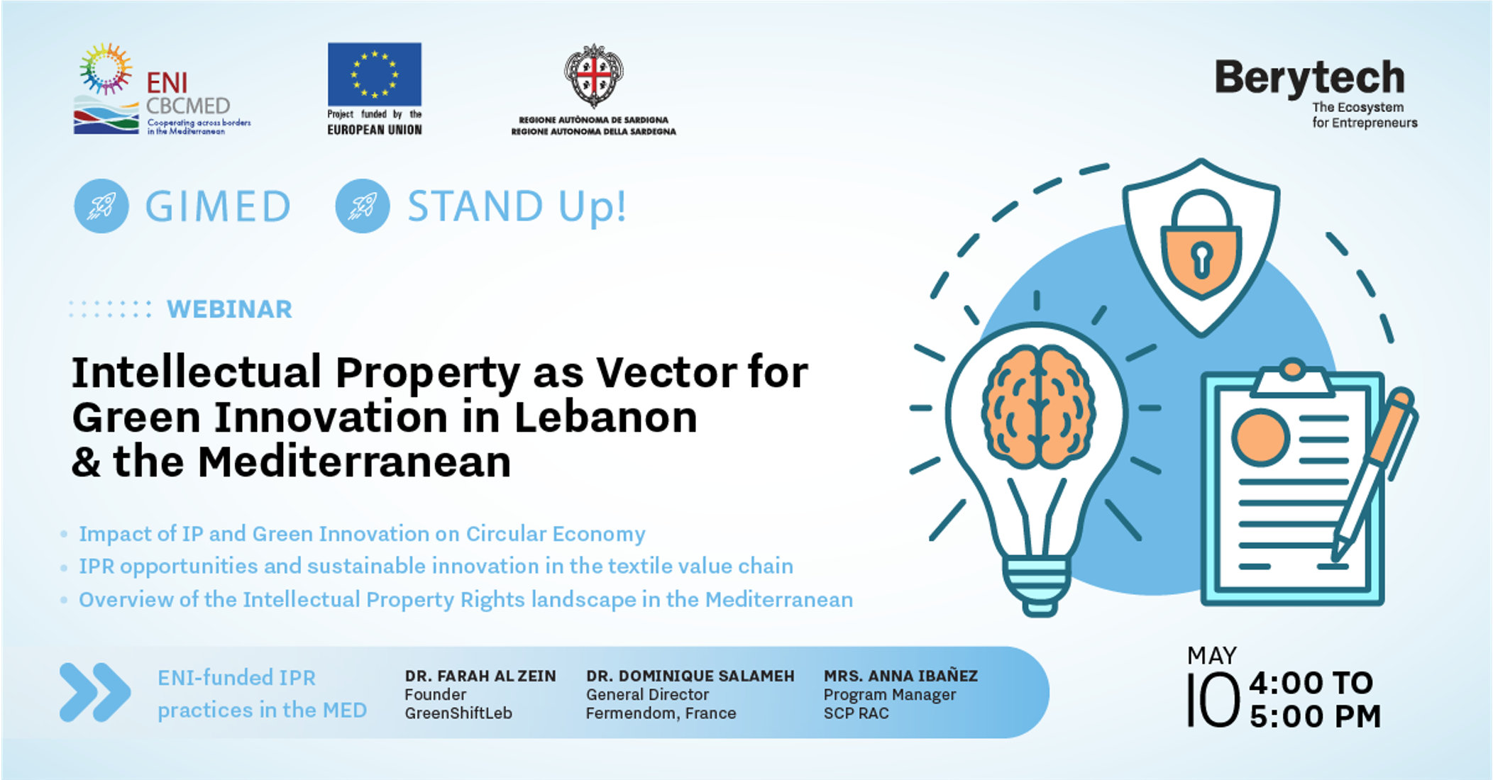 إثر إعداد تقريرين وطنيّين حول حقوق الملكيّة الفكريّة في لبنان في القطاع الأخضر و في مجال النّسيج و الأزياء في إطار مشروعي GIMED و STAND Up! تباعا بتمويل من الاتحاد الأوروبي تحت مظلّة برنامج التعاون عبر الحدود في حوض البحر الأبيض المُتوسط للآلية الأوروبية للجوار، ينظّم كلّ من Berytech و المركز الاقليمي للأنشطة بشأن الاستهلاك والإنتاج المستدامين ندوة على الخطّ لاستعراض أهمّ نتائج التّقريرين و إبراز أهميّة تنمية الاقتصاد الدائري في لبنان و في المنطقة المتوسطيّة.