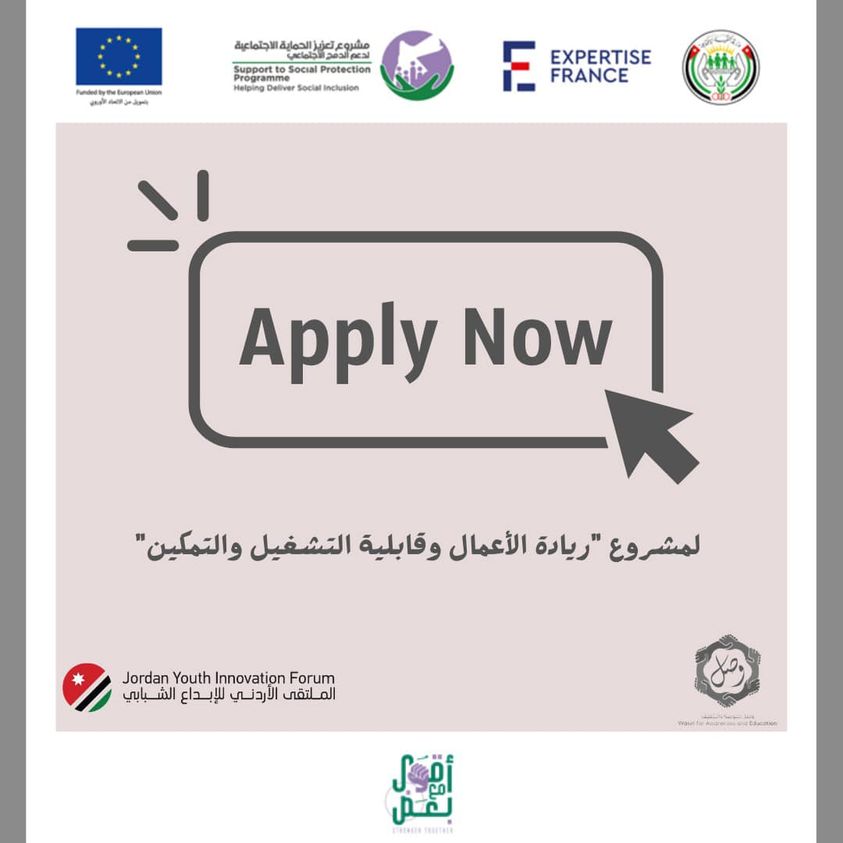 ما تستنى وقدم طلبك الان للإنتساب لمشروع ريادة الأعمال وقابلية التشغيل والتمكين بتنفيذ من مؤسسة وصِل للتوعية والتثقيف وبالشراكة مع الملتقى الأردني للإبداع الشبابي وبتمويل من الاتحاد الأوروبي وبالشراكة مع منظمة الخبرة الفرنسية ووزارة التنمية الاجتماعية