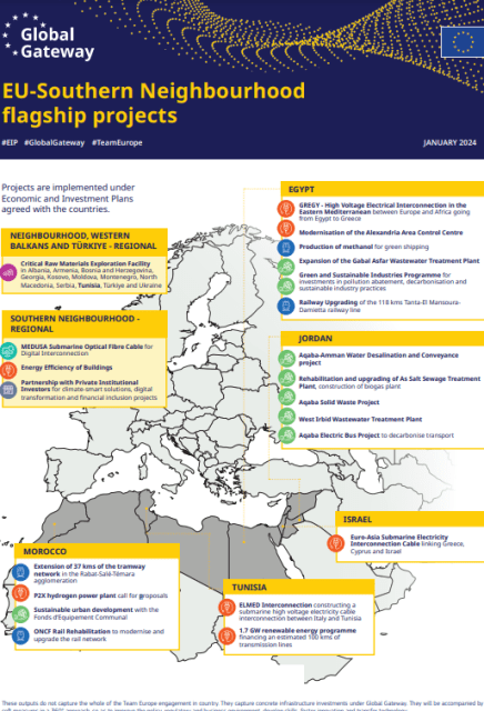 تقدّم هذه المذكّرة المشاريع الرّائدة للاتحاد الأوروبي في الجوار الجنوبي. لا تشمل هذه المخرجات كامل العمل القطري لفريق أوروبا في البلد بل تلتقط الاستثمارات الفعليّة في البنية التحتية في إطار البوابة العالمية.