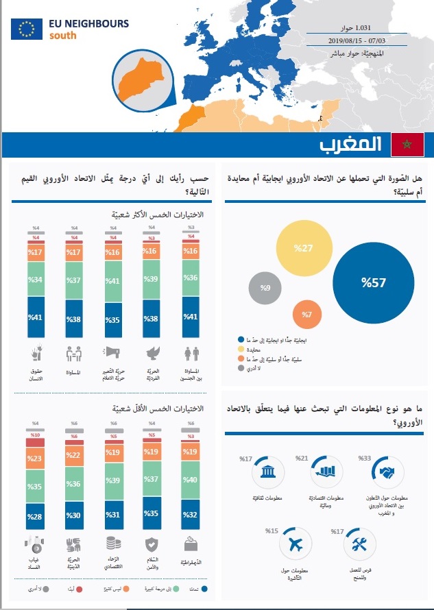 يدخل استطلاع الرّأي هذا في إطار سلسلة أُنجزت في سبع بلدان من ضمن البلدان الشريكة في جنوب المتوسّط ودار في المغرب بين شهري جويلية/يوليو وأوت/أغسطس 2019 مع 1031 شخص تمّ الحديث معهم في لقاء مباشر وقد طُرحت على المشاركين أسئلة بشأن ادراكهم العام للاتحاد الأوروبي والقيم المرتبطة به وحول علاقات الاتحاد الأوروبي ببلادهم ومفعول الدّعم المالي الأوروبي. تطرّق الاستبيان أيضًا إلى المصدر المفضّل الذي يستقي منه المستجوبون المعلومات وإلى ما يشعرون به تجاه وضعهم الشخصي وأوضاع بلادهم وتطلّعاتهم المستقبليّة.