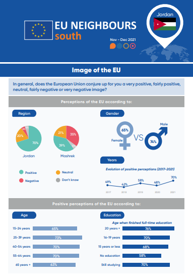 يحمل أكثر من نصف المغاربة صورة ايجابيّة عن الاتحاد الأوروبي ويشعر75% من المستجوبين أنّ بلادهم لها علاقات جيّدة مع الاتحاد الأوروبي و يعتقد 61% ممن لهم علم بأن الاتحاد الأوروبي يقدّم مساعدة ماليّة إلى المغرب أنّ تلك المساعدة فعّالة. هذه بعض النـتائج التي توصّل إليها آخر استطلاعات الرّأي السنويّة التي أُنجزت في المغرب ونشرها مشروع الجوار الأوروبي جنوب.