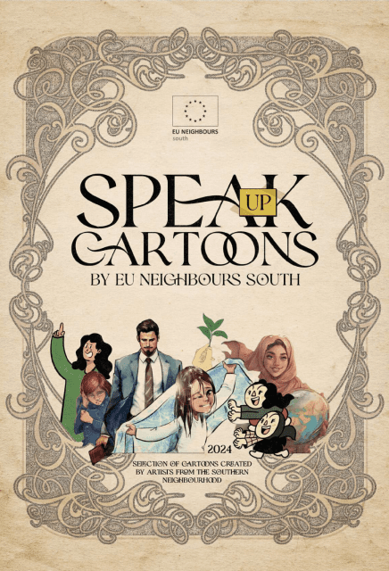 SPEAK UP CARTOONS! 2024 يمثل الإصدار الثاني من الرّسوم الكرتونيّة التي جمعها برنامج الاتصال الإقليمي الذي يموله الاتحاد الأوروبي لبلدان الجوار الجنوبي، برنامج EU Neighbours South.
