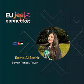 I am Rama Albashir, an EU Jeel Connector since 2022. I’ve always believed that literature and art are among the best ways to understand our societies and imagine change. That belief led me to study literature and languages at the University of Jordan, and now I’m continuing my studies with a Master’s in Diplomatic Studies in Europe.