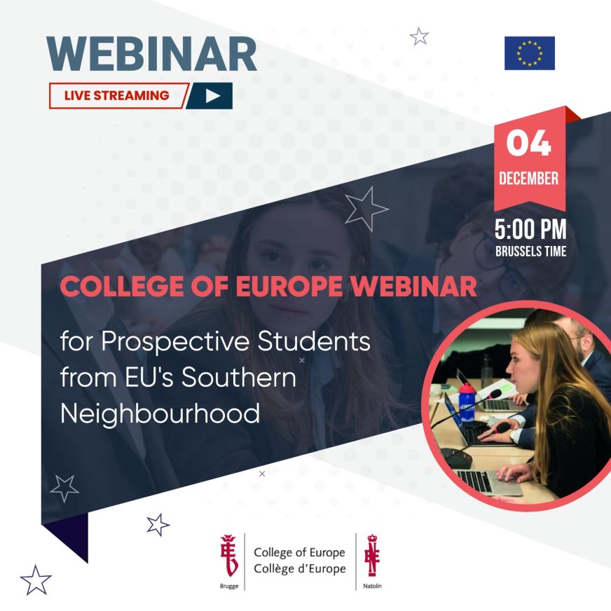 EU Neighbours South, in collaboration with the College of Europe, invites students and young professionals from the EU’s Southern Neighbourhood to an exclusive webinar about post-graduate opportunities with full scholarships!