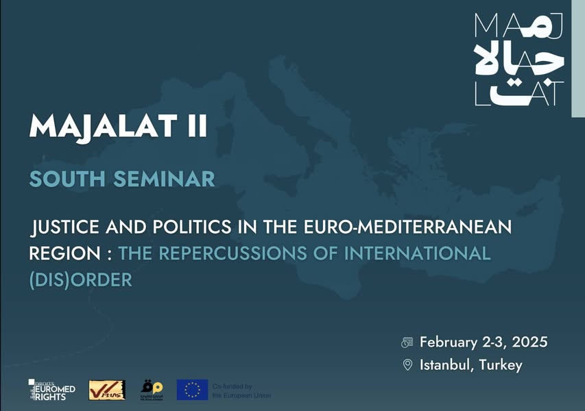 The MAJALAT II project consortium, composed of EuroMed Rights, Forum des Alternatives (Maroc), and Legal Agenda (Lebanon), is hosting the second edition of the Southern Euro-Mediterranean Seminar on February 2-3, 2025, in Istanbul, Turkey.