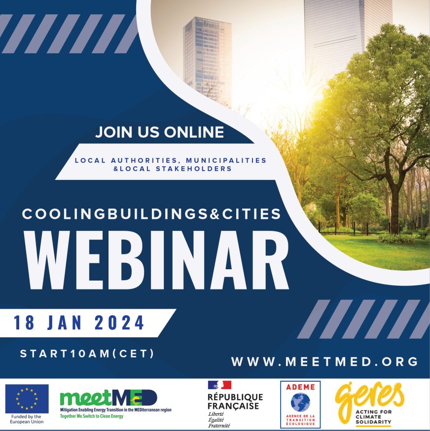 When leaders gathered for the United Nations Climate Change Conference COP28, being encouraged by UNEP to sign a pact, the “ Global cooling pledge” to broaden access to a range of sustainable cooling services and technologies, a push that comes with 2023 poised to become the hottest year on record, we invite Mediterranean territories and energy agencies to take action on this topic. On this occasion, a webinar taking place on Thursday 18 January from 10:00 to 11:30 CET time will present and discuss different solutions for improving comfort, reducing the impact of the Urban Heat Island effect, rationalise energy consumption and environmental impacts in MED cities related to urban form, building technologies and systems, as well as policies and residents’ behaviors. Through a multidisciplinary approach and crossed regards between energy experts and urban planning experts, it aims at giving keys to local authorities in implementing adequate solutions in their context, adapting their cities and buildings to climate change.