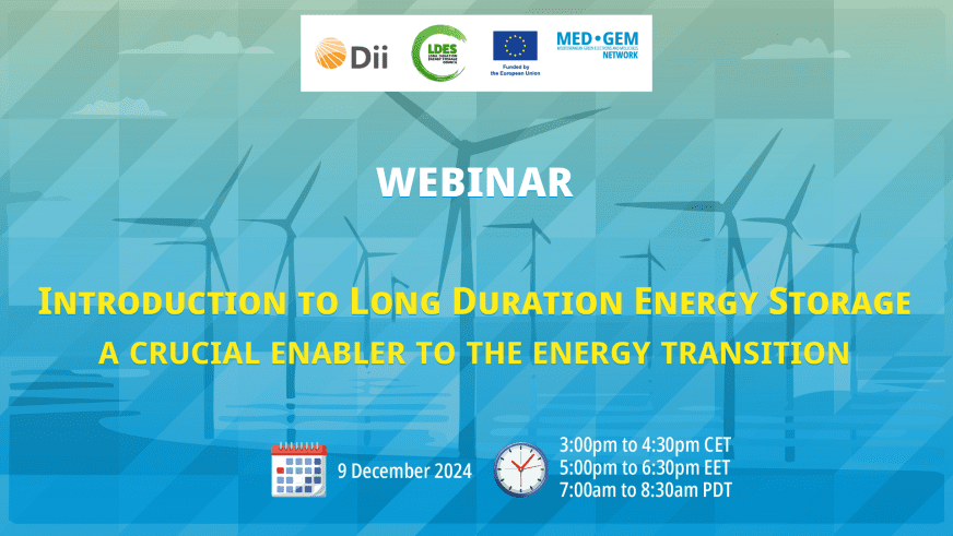 Long Duration Energy Storange Council, Dii Desert Energy and MED-GEM are delighted to join forces to host the online webinar ‘Introduction to Long Duration Energy Storage, a crucial enabler of the energy transition’ on December 9th, 2024 from 14:00 CET to 15:30 CET.