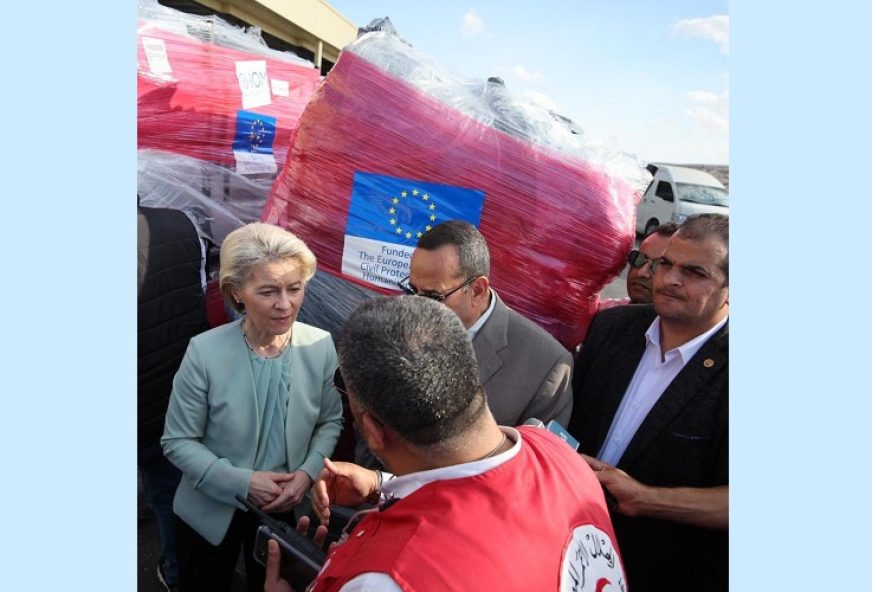 « Monsieur le Gouverneur, je vous remercie infiniment de m’accueillir ici à El Arish. Je suis très reconnaissante au président Al-Sissi de m’avoir invitée à venir en Égypte et à assister aux opérations d’aide humanitaire qui se déroulent ici, à El Arish, et au point de passage frontalier de Rafah. Avant tout, je tiens à remercier les autorités égyptiennes – vous personnellement, Monsieur le Gouverneur – d’avoir garanti l’accès humanitaire à Gaza et en provenance de Gaza via Rafah, et d’avoir rapidement mis en place la plate-forme El Arish pour entreposer des fournitures vitales. L’Égypte offre véritablement une bouée de sauvetage à Gaza. Et l’Union européenne tire pleinement parti de ce secours pour répondre aux besoins humanitaires à Gaza.