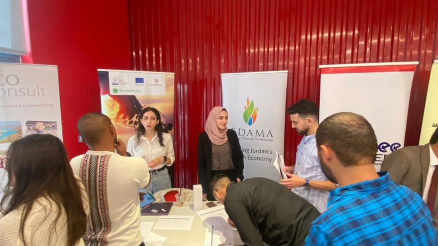 Med4Waste a pris part à plusieurs campagnes de sensibilisation auprès des étudiants et des jeunes diplômés en Jordanie. Dans le cadre de cette initiative, le projet Med4Waste a participé activement à des événements organisés les 5 et 10 octobre visant à sensibiliser les jeunes aux possibilités durables et aux meilleures stratégies de gestion des déchets tirées de l’expérience de ses projets capitalisés, qui sont eux aussi financés par l’intermédiaire du programme IEV CTF Med.