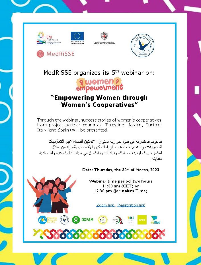 Le 30 mars 2023 à 11 h 30 (heure de l’Europe centrale), l’Université An-Najah et les partenaires du projet MedRiSSE vous invitent à participer à leur webinaire d’apprentissage via Zoom pour discuter des moyens d’accroître l’emploi des femmes et de renforcer leur autonomie grâce à la promotion et au soutien des coopératives féminines.