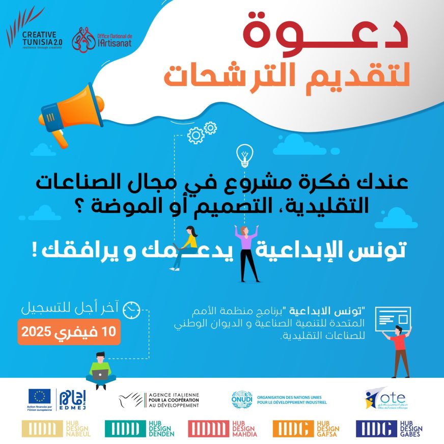 Ce programme est initié par Creative Tunisia 2.0, projet mis en œuvre par l’ONUDI en partenariat avec l’Office National de l’Artisanat Tunisien dans le cadre du programme européen EDMEJ et financé par l’Union européenne avec une contribution de l’Agence Italienne pour la Coopération au Développement, et qui accompagne ses bénéficiaires à travers diverses initiatives, en visant particulièrement à renforcer les opportunités d’intégration professionnelle et de création d’entreprises durables et inclusives pour les jeunes, les femmes et les migrants de retour.