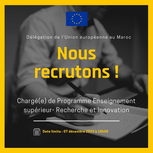 La Délégation de l’Union européenne au Maroc recrute un-e agent local, pour le poste de Chargé(e) de Programme Enseignement supérieur- Recherche et Innovation, sous contrat à durée indéterminée, dans le cadre de la législation locale marocaine.