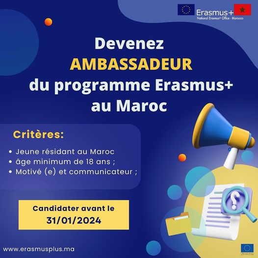 Vous êtes un/une jeune dynamique, passionné (e) par le partage et le volontariat. Le Bureau National Erasmus+ Maroc vous donne l’opportunité de devenir Ambassadeur Erasmus+ dans votre ville.