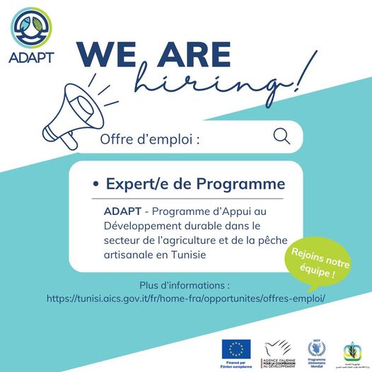 ADAPT recrute et recherche un(e) Expert(e) de Programme passionné(e) pour rejoindre leur équipe à Tunis et contribuer au succès du programme ADAPT, dédié au développement durable dans les secteurs de l’agriculture, de l’aquaculture et de la pêche durables en Tunisie.