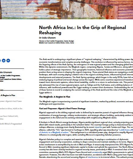 Le monde arabe traverse une phase importante de « recomposition régionale », caractérisée par des dynamiques de pouvoir changeantes, des transformations économiques et des défis sécuritaires complexes. Cette évolution est influencée par divers facteurs, notamment les effets persistants du Printemps arabe, l’émergence de nouvelles puissances régionales et l’évolution du paysage mondial. Dans ce contexte dynamique, la région du Maghreb, composée de l’Algérie, de la Tunisie et du Maroc, ainsi que de l’Égypte, occupe une place stratégique. Leur situation géographique, leur influence historique et leur potentiel économique en font des acteurs clés pour façonner la trajectoire de la région. Ces États arabes pivots évoluent dans un paysage multiforme, chaque pays jouant un rôle spécifique dans l’évolution future de la région, influencé à la fois par les évolutions internes et les pressions externes.