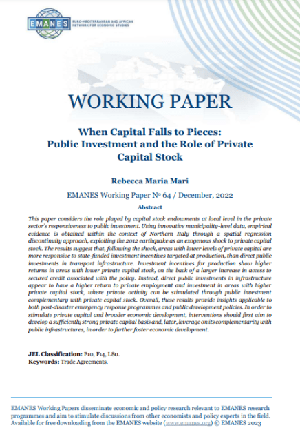 Ce document examine le rôle joué par les dotations en capital au niveau local dans la réactivité du secteur privé à l’investissement public. En utilisant des données innovantes au niveau des municipalités, des preuves empiriques sont obtenues dans le contexte du nord de l’Italie au moyen d’une approche de discontinuité de la régression spatiale exploitant le tremblement de terre de 2012 comme un choc exogène sur le stock de capital privé. Les résultats suggèrent qu’à la suite de ce choc, les zones où les niveaux de capital privé sont plus faibles sont plus réactives aux incitations à l’investissement financées par l’État et ciblées sur la production qu’aux investissements publics directs dans les infrastructures de transport. Les incitations à l’investissement dans la production se traduisent par des rendements plus élevés dans les zones où le stock de capital privé est plus faible, en raison d’un meilleur accès au crédit garanti associé à la politique.