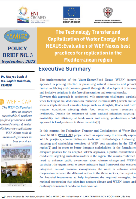 Ce document d’orientation présente une analyse des contributions reçues sur la sensibilisation, les connaissances, la perception et les attentes des parties prenantes en ce qui concerne la situation du changement climatique dans l’UE et les pays partenaires méditerranéens, l’étendue du lien entre l’eau, l’énergie et l’alimentation, les difficultés de mise en œuvre de l’approche intégrée de ce lien dans la région, ainsi que les effets de sa mise en œuvre afin d’évaluer/de valider les résultats produits par le projet. Enfin, le document présente des recommandations opérationnelles fondées sur des données probantes sur les moyens de faire progresser et d’adopter l’approche du lien entre l’eau, l’énergie et l’alimentation.