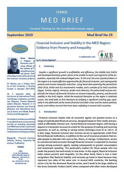 La série de Policy Briefs du FEMISE intitulée MED BRIEF ambitionne de fournir une réflexion novatrice pour la région euro-méditerranéenne. Les Policy Briefs contiennent une analyse succincte et politiquement pertinente sur d’importantes questions EuroMed et présentent aux décideurs politiques les points de vue des chercheurs FEMISE et des partenaires du réseau.
