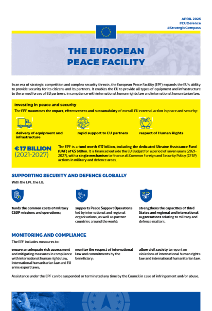 À l’ère de la concurrence stratégique et des menaces complexes pour la sécurité, la Facilité européenne pour la paix (FEP) renforce la capacité de l’UE à assurer la sécurité de ses citoyens et de ses partenaires. Elle permet à l’UE de fournir tous types d’équipements et d’infrastructures aux forces armées de ses partenaires, dans le respect du droit international des droits de l’homme et du droit international humanitaire.