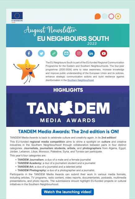 EU Neighbours South est le programme de communication régional de l’Union européenne pour le voisinage Sud. Il vise à sensibiliser, accroître les connaissances et améliorer la compréhension du public de l’UE et de ses politiques, renforcer les actions de communication stratégique et renforcer la résilience contre la désinformation dans le voisinage Sud.