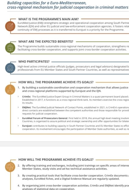 Cette brochure décrit le programme consacré au renforcement de la coopération judiciaire transfrontalière dans la région méditerranéenne EuroMed Justice, qui est mis en œuvre par Eurojust et financé par la Commission européenne (DG NEAR). Elle présente les buts et les objectifs du programme, les moyens mis en œuvre pour les atteindre ainsi que les avantages escomptés.