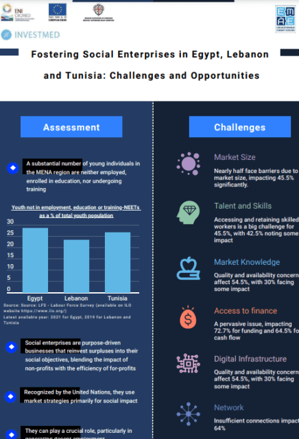 Cette infographie met en évidence les principales recommandations du document d’orientation intitulé « Promouvoir les entreprises sociales en Égypte, au Liban et en Tunisie : défis et possibilités ».