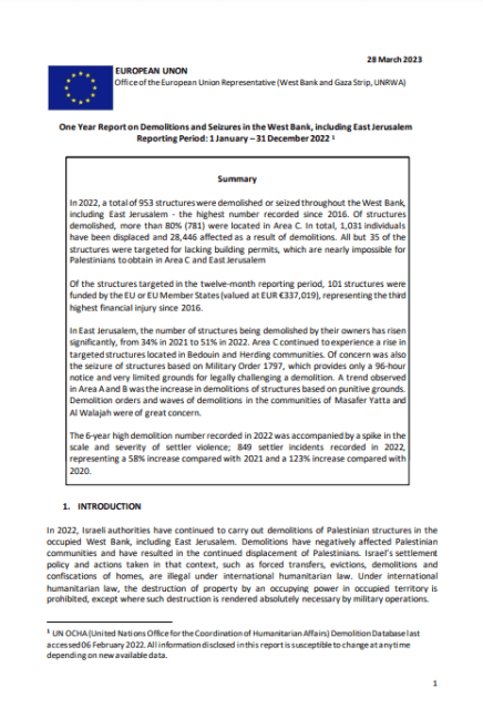 En 2022, 953 structures ont été démolies ou saisies en Cisjordanie, y compris à Jérusalem-Est, ce qui représente le nombre le plus élevé enregistré depuis 2016. Parmi les structures démolies, plus de 80 % (781) se trouvaient dans la zone C. Au total, 1 031 personnes ont été déplacées et 28 446 personnes ont été affectées à la suite de démolitions. Toutes les structures, à l’exception de 35 d’entre elles, ont été ciblées en raison de l’absence de permis de construire, qui sont quasiment impossibles à obtenir par les Palestiniens dans la zone C et à Jérusalem-Est.