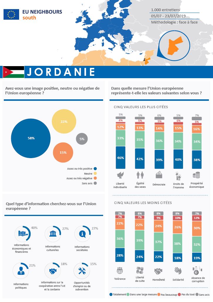 L’enquête, qui fait partie d’une série de sondages d’opinion réalisés dans sept pays partenaires du sud de la Méditerranée, a été menée en Jordanie en juillet 2019, auprès de 1 000 personnes interrogées de vive voix. Les questions posées aux participants portaient sur leur perception générale de l’UE et des valeurs qu’elle véhicule, sur les relations de l’UE avec leur pays et sur l’impact du soutien financier de l’UE. L’objectif était également de découvrir leurs vecteurs d’information préférés, leur ressenti par rapport à leur situation personnelle et celle du pays, ainsi que leurs attentes.