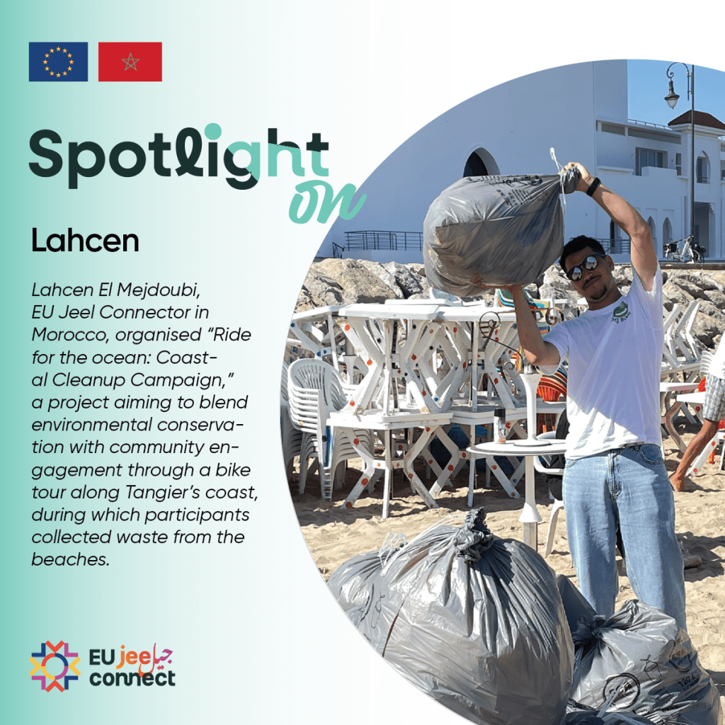 Lahcen El Mejdoubi organised the “Ride for the Ocean: Coastal Cleanup Campaign,” a project that combines environmental conservation with community action. The initiative featured a bike tour along Tangier’s stunning coastline, where participants worked together to collect waste from the beaches, promoting sustainability and marine protection.