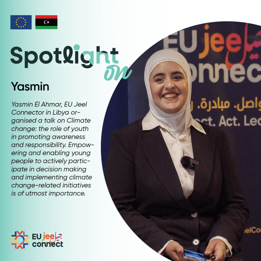Yasmin El Ahmar, an EU Jeel Connector in Libya, organised a compelling talk on Climate Change: The Role of Youth in Promoting Awareness and Responsibility. The event emphasised the crucial role young people play in decision-making processes and in implementing climate-related initiatives, ensuring their active participation in shaping a sustainable future.