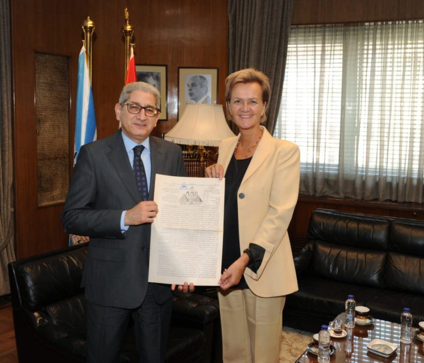 On 1 October, the Ambassador of the European Union to Egypt, Angelina Eichhorst, paid a visit to the historic headquarters of Al-Ahram newspaper in downtown Cairo to join the celebrations of the daily’s 150th anniversary. During the visit, Ambassador Eichhorst met with Mr. Maguid Mounir, Editor-in-Chief of Al-Ahram, who presented her with a symbolic gift: a copy of the very first edition of the newspaper. She highlighted the newspaper’s enduring impact and paid tribute to the journalists who continue to carry forward this legacy. This anniversary not only celebrates the heritage of one of the Arab world’s most prominent newspapers, but also reaffirms the essential role of free and independent media in fostering dialogue, mutual understanding, and democratic development.