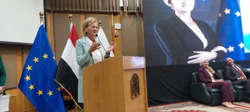On 11 November, the Ambassador of the European Union to Egypt, Angelina Eichhorst, took part in the closing session of the EU Simulation Model at Assiut University, attended by around 200 students. The event marked the conclusion of a series of interactive sessions designed to help students understand the European Union’s institutions, values, and decision-making processes.