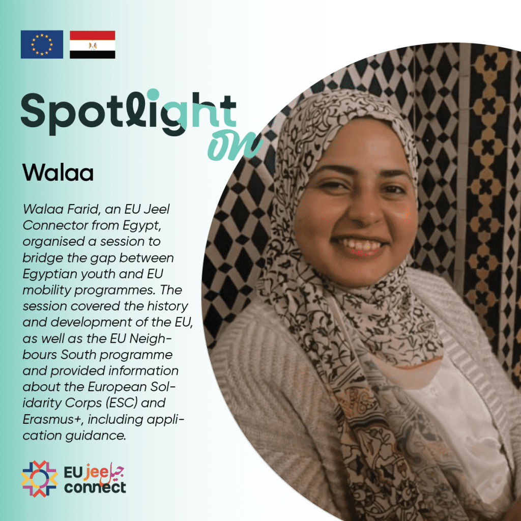 Walaa organised a session to bridge the gap between Egyptian youth and EU mobility programmes. The session covered the history and development of the EU and provided information about the European Solidarity Corps (ESC) and Erasmus+, including application guidance.