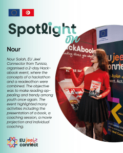 Another success: Nour Salah, EU Jeel Connector from Tunisia, organised a 2-day Hackabook event, where the concepts of a hackathon and a readeathon were combined. The objective was to make reading appealing and trendy among youth once again. The event highlighted many activities including the presentation of a book, a coaching session, a movie projection and individual coaching.