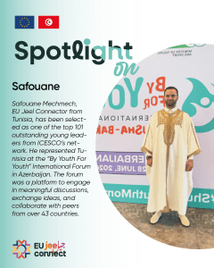Meet Safouane Mechmech, EU Jeel Connector from Tunisia, who has been selected as one of the top 101 outstanding young leaders from ICESCO’s network. He represented Tunisia at the “By Youth For Youth” International Forum in Azerbaijan. The forum was a platform to engage in meaningful discussions, exchange ideas, and collaborate with peers from over 43 countries.