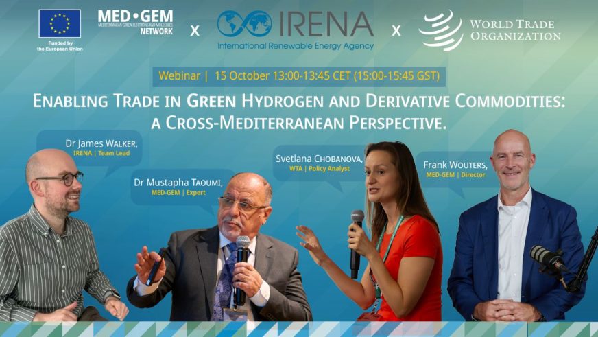 The International Renewable Energy Agency (IRENA), the World Trade Organization (WTO) Secretariat, and the EU-funded MED-GEM Network are jointly organising an online webinar titled “Enabling Trade in Green Hydrogen and Derivative Commodities: A Cross-Mediterranean Perspective” on 15 October, from 13:00 to 13:45 CET (15:00 to 15:45 GST).