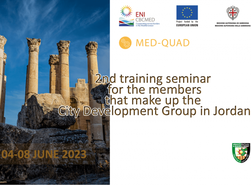 Al-Balqa Applied University, the Jordanian partner for the MED-QUAD project, funded by the European Union under the ENI CBC Mediterranean program, has invited the City Development Group (CDG) representatives of the Quadruple Helix Approach to participate in the 2nd training session. The 2nd one-week training will occur from 04 to 08 June 2023 in Irbid, Jordan, at the Al-Balqa Applied University.