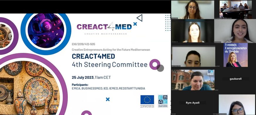 CREACT4MED held its 4th Steering Committee with lead partner, the Euro-Mediterranean Economists Association, and project partners, the European Institute of the Mediterranean (IEMed), the Institute of Entrepreneurship Development (iED), the Union of Mediterranean Confederations of Enterprises (BUSINESSMED), and Redstart Tunisie.