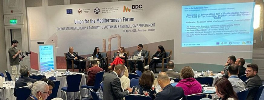 Amman, 30 April 2025. The Mediterranean region is advancing green entrepreneurship and digital transformation as pathways to fair and inclusive economic growth. This emerging trend is paving the way for opportunities for job creation and self-employment, including vulnerable groups, especially among youth and women in the region. With nearly half the population in Southern and Eastern Mediterranean countries under 25 years of age capitalising on the potential of youth through green practices and entrepreneurship is vital for inclusive economic growth and positive social impact. The UfM Forum “Green Entrepreneurship: A Pathway to Sustainable and Inclusive Employment,” part of the UfM Roadmap on Employment and Labour (2022-2025), provided an opportunity to explore the link between green entrepreneurship and fair, inclusive economic growth. It presented initiatives from the UfM Grant Scheme to promote Employment and Entrepreneurship in the Green Economy, particularly “GREEN&FAIR” and “Get Into Green” which are supporting women and youth from vulnerable communities across the Mediterranean.