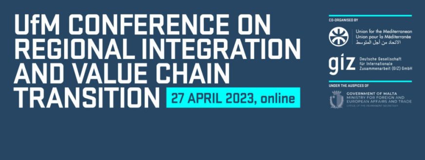 The UfM and the German Development Cooperation will co-organise the virtual UfM Conference on Regional Integration and Regional Value Chains online on 27 April 2023 under the auspices of The Ministry of Foreign and European Affairs and Trade of the Republic of Malta. Bringing together partners and stakeholders from the Euro-Mediterranean Region, and informed by past shocks that include the pandemic crisis, the current regional and global geopolitical and socio-economic disruptions, the Conference will focus on two thematics of paramount importance for the Mediterranean, namely “Economic Integration in times of crisis” and “What does a Green Transition mean for regional value chains?”