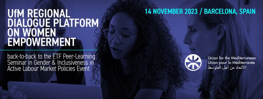 The UfM Regional Dialogue Platform on Women Empowerment back-to-back to the ETF Peer-Learning Seminar in Gender & Inclusiveness in Active Labour Market Policies Event, will be held in Barcelona on the 14th, 15th , and 16th of November 2023.