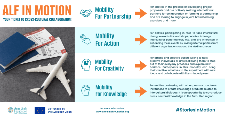 Mobility For Action: For entities participating in face-to-face intercultural dialogue events like workshops, debates, trainings, intercultural performances, etc. and are interested in enriching these events by inviting external parties from different organisations around the Mediterranean.