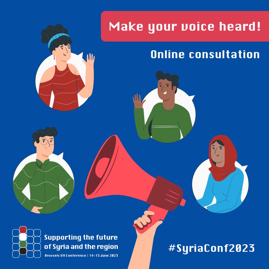 Take part in a survey aimed at gathering the opinions of the Syrian population and civil society in Syria and neighboring countries, subsequently contributing to the Day of Dialogue at the seventh Brussels Conference ‘Supporting the future of Syria and the region’.