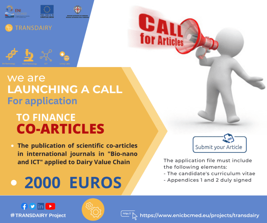 Researchers, doctoral students, post-doctoral students with innovative technologies in Bio-Nano and ICT applied to the Dairy Value Chain and wishing to publish scientific articles in international journals. Co publications with at least one of the Living Lab participants from the partner countries ( Italy, Greece, Tunisia ) of the TRANSDAIRY project will be highly encouraged.