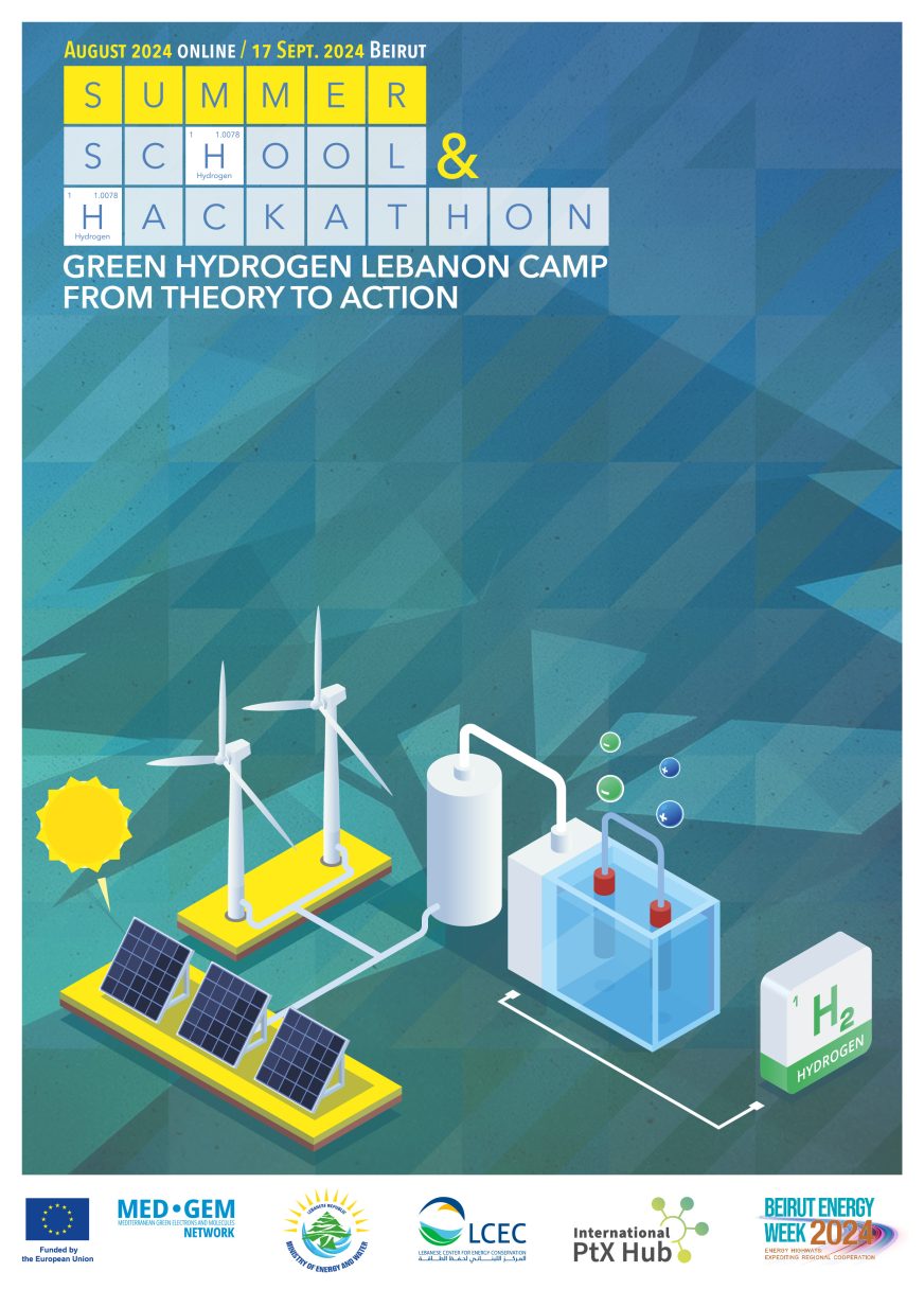 Under the patronage of the Ministry of Energy and Water (MEW), the Lebanese Center for Energy Conservation (LCEC) and the European Union funded Mediterranean Green Electrons and Molecules Network (MED-GEM) are thrilled to announce “Green Hydrogen Lebanon Camp: From Theory to Action. », a pioneering program combining an intensive online training on Power-to-X (PtX) technologies and a 24h Hackathon focused on renewable energy and green hydrogen solutions in-and-for Lebanon.