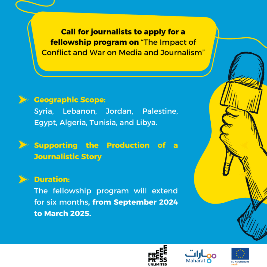 Free Press Unlimited (FPU), in collaboration with Maharat Foundation, is launching a fellowship program on “The Impact of Conflict and War on Media and Journalism in the MENA.”