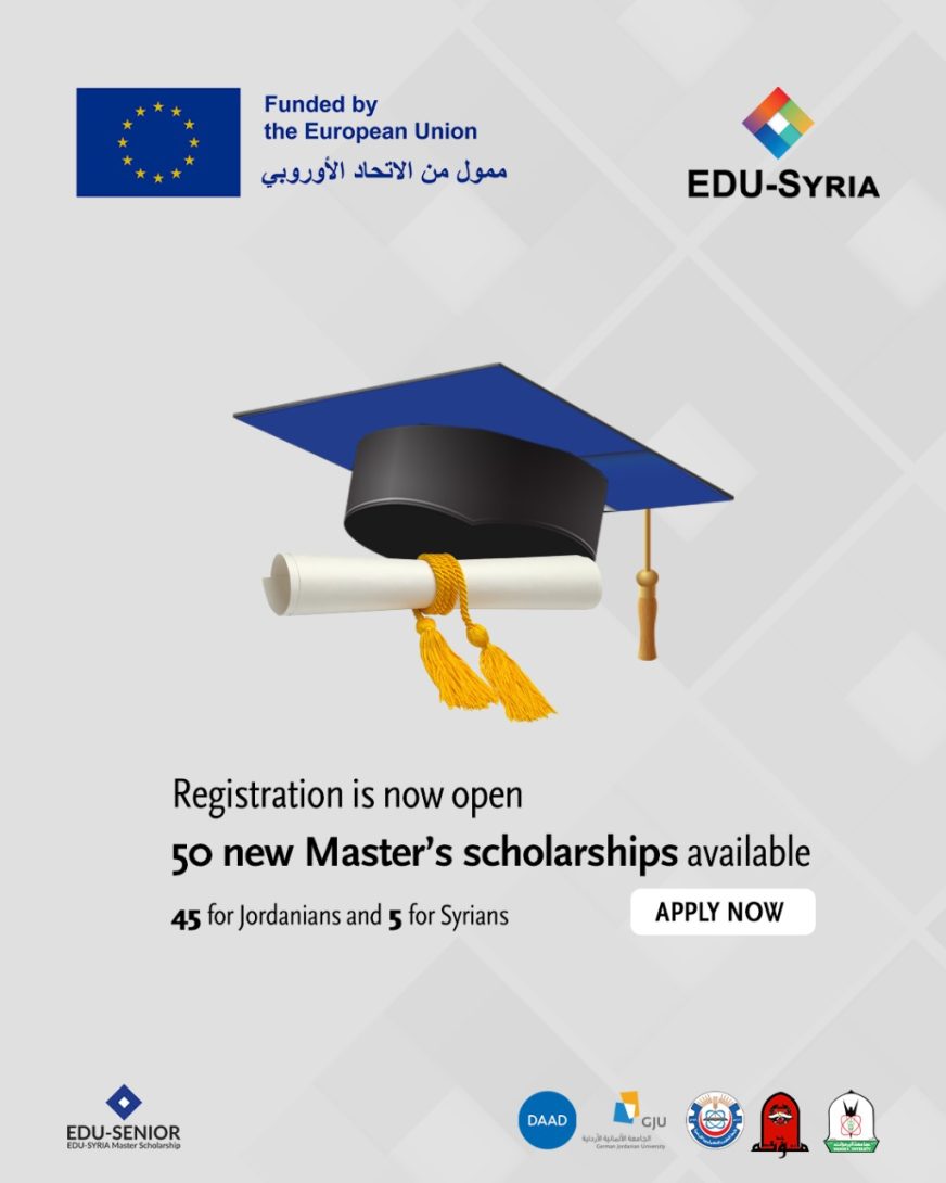 The EDU-SYRIA program, funded by the European Union (EU) and managed by the German Jordanian University (GJU) in cooperation with the German Academic Exchange Service (DAAD), is pleased to announce a new package of fully funded scholarships for enrollment in graduate studies (Master’s degree) for the 2025/2026 academic year.