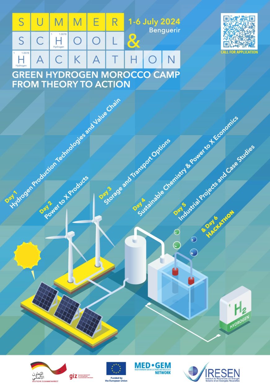 From July 1 to 6, 2024, the Deutsche Gesellschaft für Internationale Zusammenarbeit (GIZ), the Research Institute for Solar Energy and New Energies (IRESEN), and the European Union funded MED-GEM Network organize a summer school and a hackathon under the theme “Green Hydrogen Morocco Camp: From Theory to Action.”